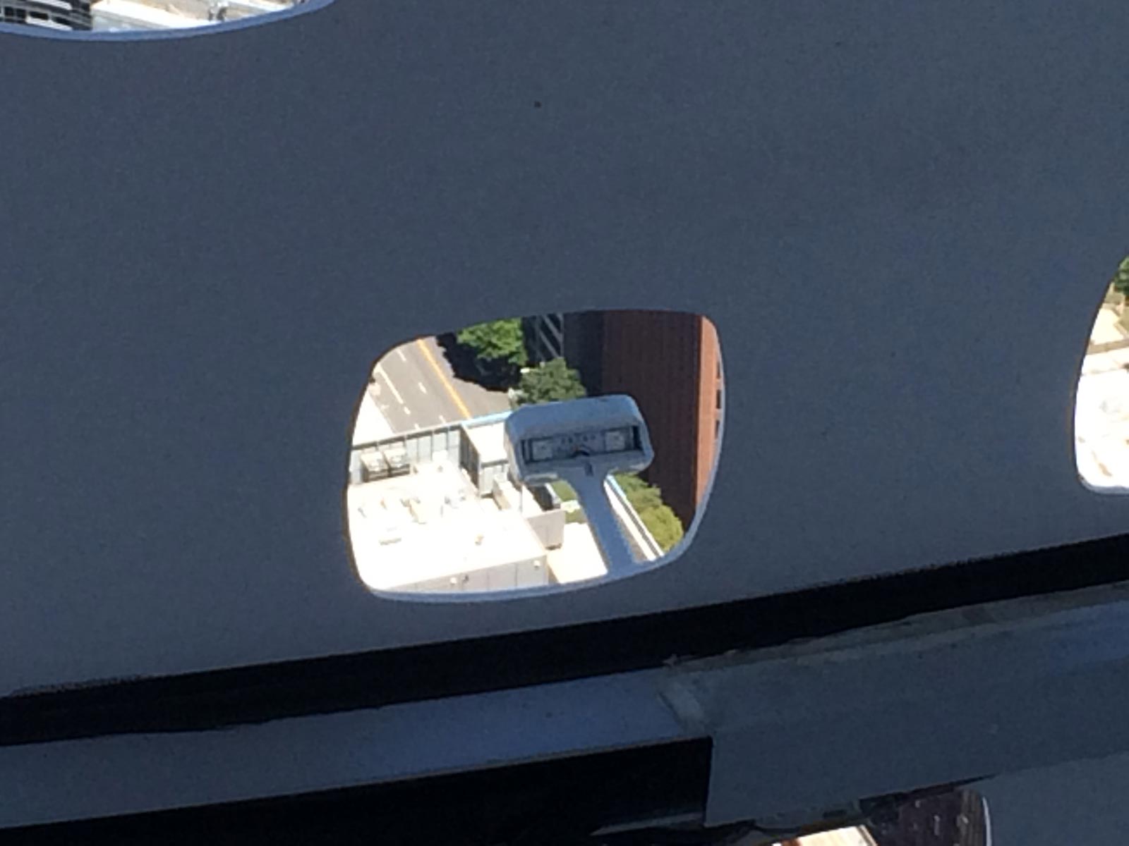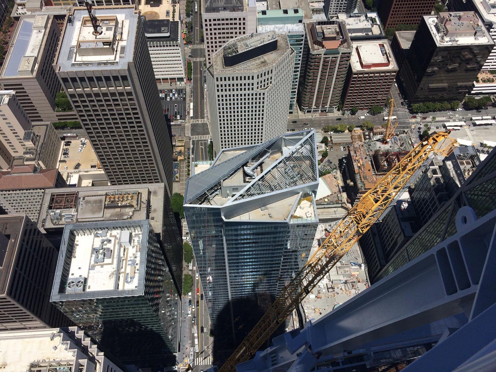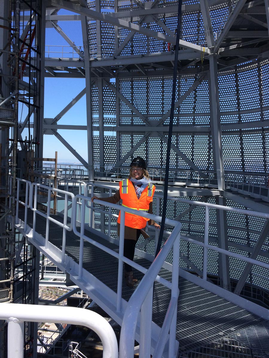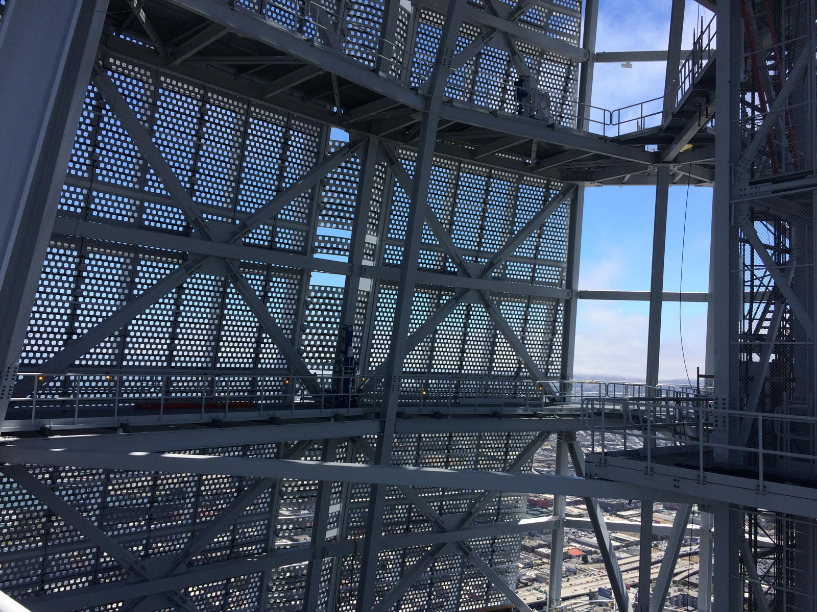 It’s one thing to look at renderings and drawings on your computer screen, or if you’re lucky, as we were, to check out some awesome scaled mockups of Jim Campbell’s amazing LED piece “Day for Night”, but it’s another thing altogether to be over 1,000 feet above street level during construction and take stock of the scale of the piece we were working on. The top of the tower is enclosed in a perforated skin that completes the shape of the tower. By night this skin comes alive from within and then becomes an illuminated screen as LED’s light the outer surface of the perforated metal skin.