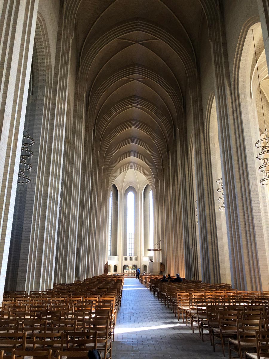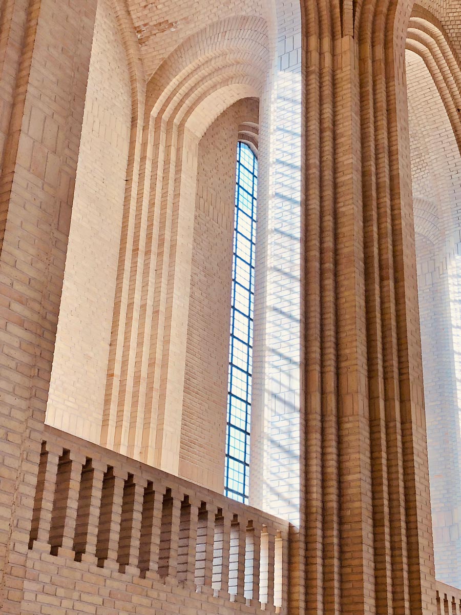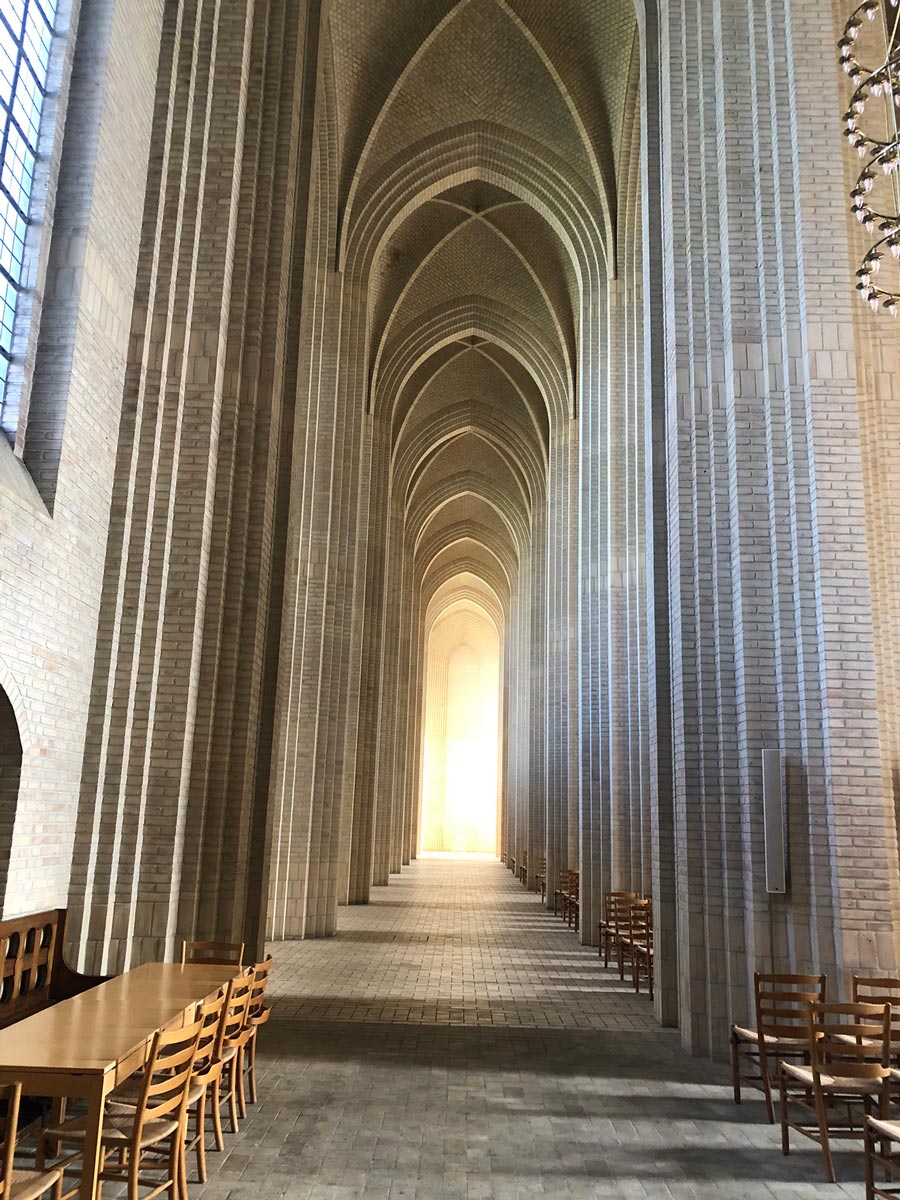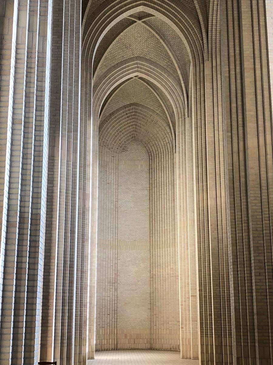 I knew very little about Grundtvig’s Church in Copenhagen, a twenty-minute bike ride from central Copenhagen made it seem like a decent excursion on a bright and fresh September day. It is located in a modest residential neighborhood. It is sited at the center of a square created by modest houses built at the same time as the church (1921-1940). Inside, the interaction and quality of the light and the space is marvelous. The only material used is blond brick; the floor, columns, and vaulted ceilings are all composed of this humble material. The results are stunningly sublime. The role of light in places of worship is of paramount importance, and in this church, the unadorned, restrained simplicity of the elements results in an exquisitely calm and contemplative space. From a lighting perspective, I do wonder if the fact that all the materials share the same (fairly high) reflectance values contributes to the overall feeling of calm.